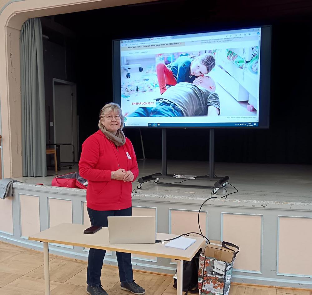 SPR järjesti meille auttajakurssin. Luennoitsijana toimi SPR:n järjestökehittäjä Eeva-Liisa Koskinen. Saimme hyvät neuvot ja opastukset kuinka toimia vahingon sattuessa.