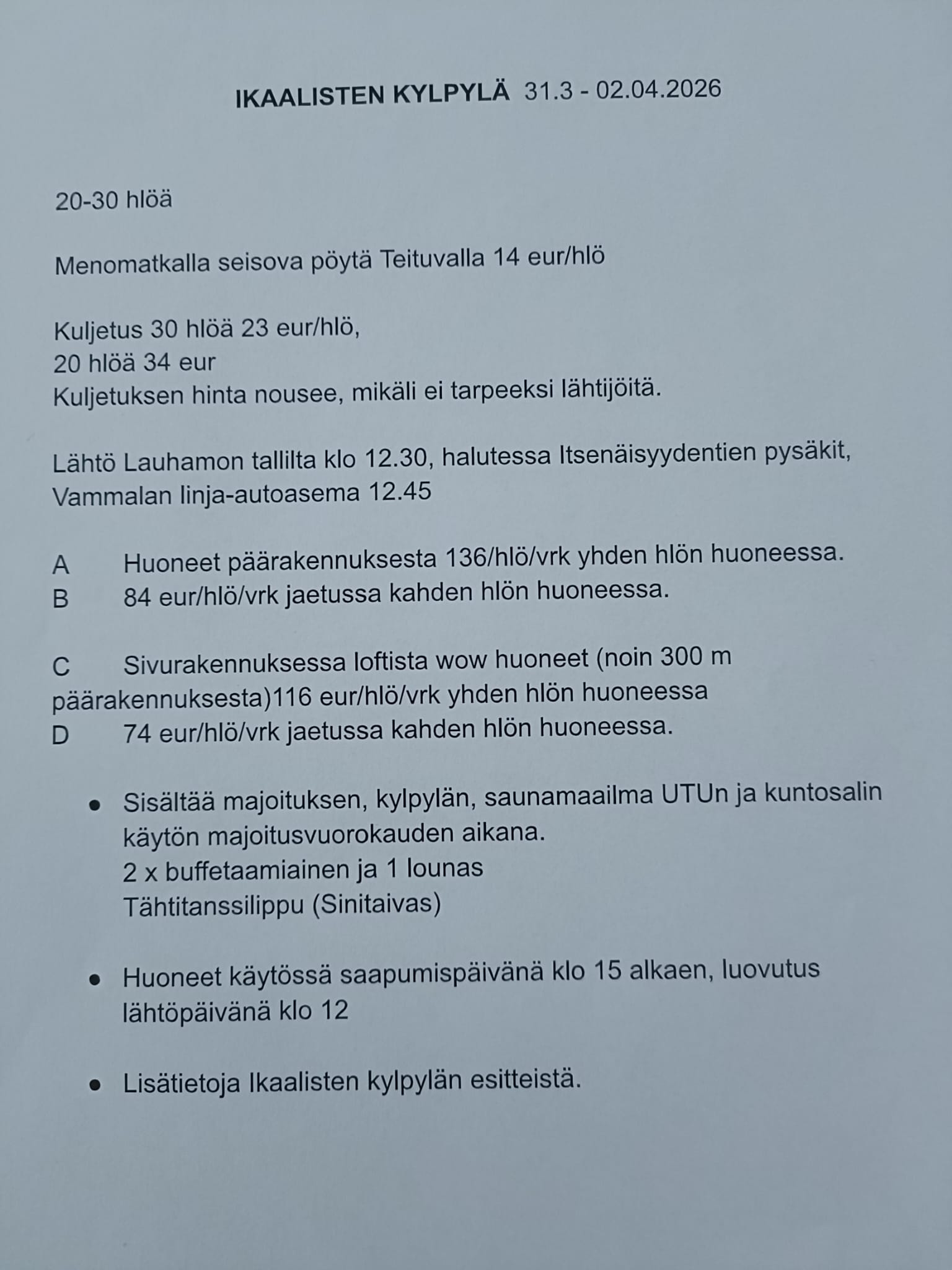 Liitteenä hinnasto. Lähtöaika linja-autoasemalta tarkentuu myöhemmin.